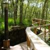 Allein für den 270 Meter langen Bohlenweg schleppten 24 Freiwillige drei Wochen lang jeweils einen Zentner schwere Eichenbohlen in das Moor. Nun führt der massive Weg mit Handlauf um den „Knust“ herum, den höchsten Teil des Moores, der in einem Schichtenmodell aufgelassen wurde. Die schwimmende Konstruktion schützt sowohl den morastigen Torfboden als auch den Holzweg. Auch der große Unterstand wurde massiv aus Holz gebaut und das Dach begrünt.