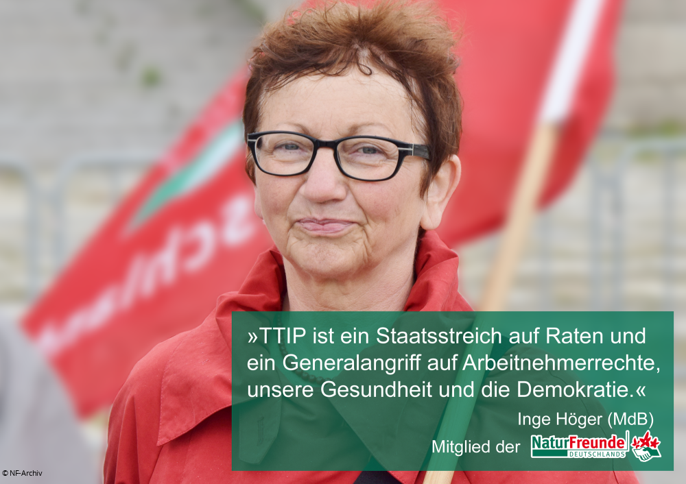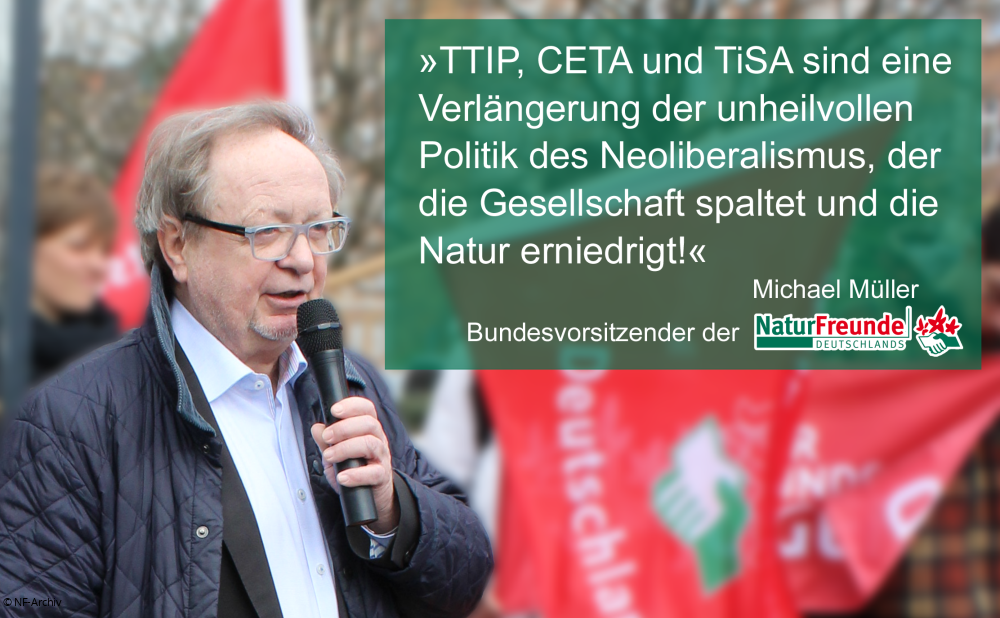 „Die geplanten Abkommen sind das geistige Produkt der neoliberalen Deregulierung – einer Ideologie, die im Jahr 2008 in die Finanzkrise geführt hat", erklärte Michael Müller, Bundesvorsitzender der NaturFreunde Deutschlands und Auftaktredner der Demo in Berlin: "Die Hauptverantwortlichen und die ideologischen Träger der Freihandelsabkommen sind die Union und auch Bundeskanzlerin Angela Merkel. Umso mehr richtet sich die Hoffnung auf die SPD. Sie muss die Verträge stoppen, wenn sie ihrer Verantwortung gerecht werden will."