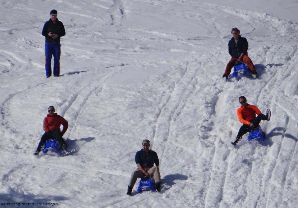 Am Sonntag stieg dann der im Programm angekündigte „Spaß-Triatlon“ mit den Disziplinen Rodeln, Langlauf und Schneeschuh-Gehen. Der Start erfolgte auf Rodelschlitten im Tiefschnee, was eine spezielle Abfahrtstechnik erforderte, wollte man nicht unfreiwillig kopfüber in den das tiefe Weiße absteigen, und führte anschließend den schnellen Winterweg hinunter zum Rinken. Dort warteten schon die zuvor angepassten Langlaufski für die 7 Kilometer Rundloipe über den Reimatihof. Ausreichendes Langlaufmaterial hatten, neben dem beim Naturfreundehaus vorhandenen, die Schneesport-Fachgeschäfte Köhler aus Dietlingen und Vogt aus Oberkirch zur Verfügung gestellt.