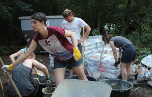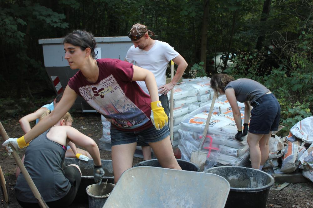 Trotzdem entwickelte sich aus der multikulturellen Truppe in kürzester Zeit eine effektive Arbeitsbrigade: Der alte Pizzaofen wurde abgerissen, der verrottete Zaun demontiert, ein neuer gebaut, das Gelände entrümpelt, der Wald entmüllt und schließlich bekam das Naturfreundehaus auch noch ein neues Emblem – handgemalt. Zwischendurch wurden Workshops und Ausflüge angeboten und es wurde viel miteinander gesprochen.