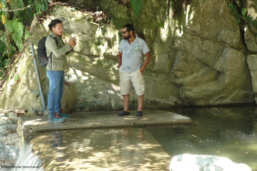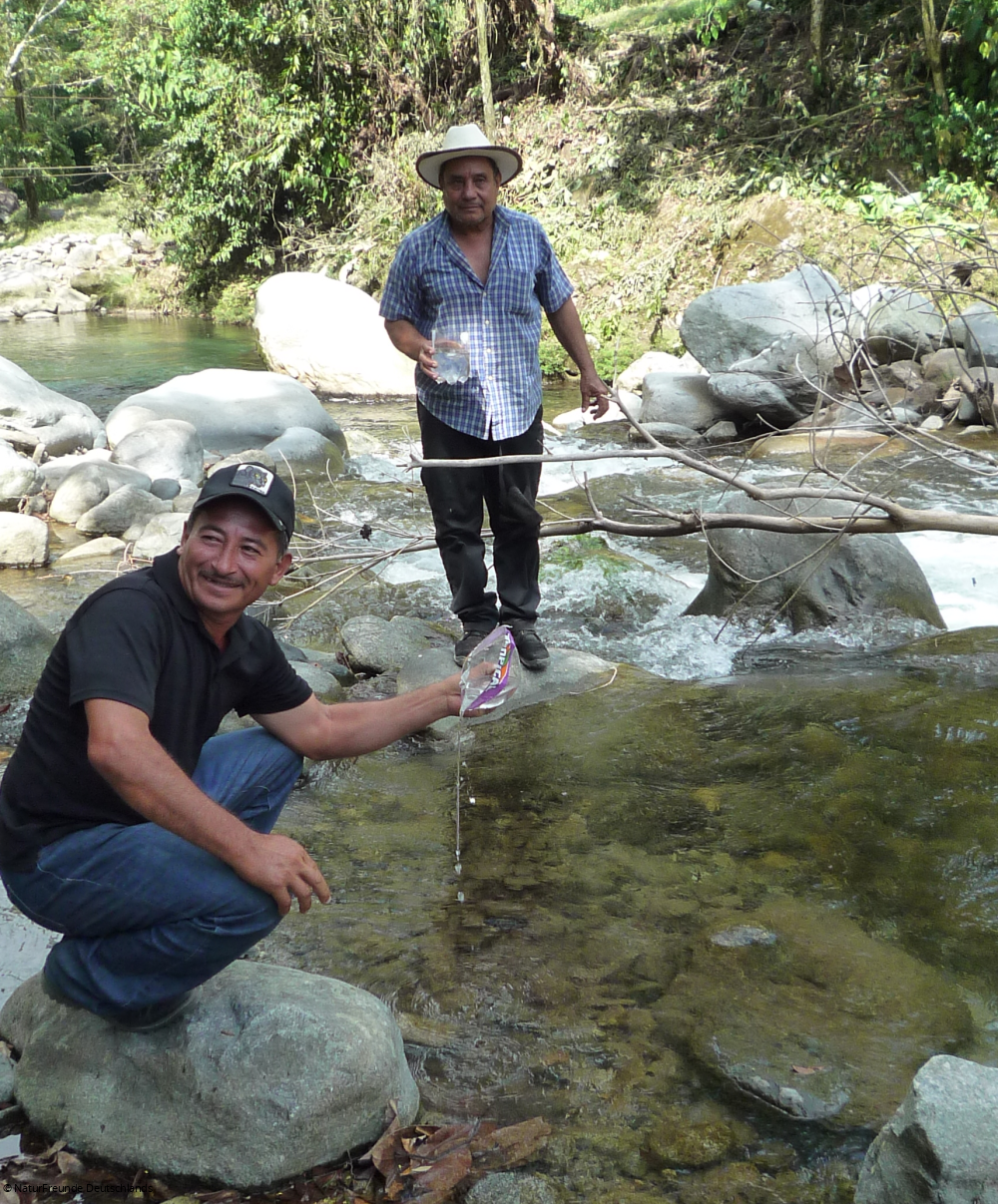 Am Versammlungsort angekommen, sind es Magda und Mitglieder des lokalen Wasserkomitees, die uns gleich zum Fluss Jilamito führen. Mittlerweile steht die Sonne hoch oben und die Luft ist feucht. Zum Glück ist es nur ein kurzer Fußmarsch bis zum Fluss. „Das Wasser ist so sauber, dass wir es zum Trinken benutzen“, erklärt Calixto vom Wasserkomitee und schöpft mit einer abgeschnittenen Plastikflasche etwas Wasser aus dem Fluss. „Als hier begonnen wurde, ein Wasserkraftwerk zu bauen, war das Wasser verschmutzt“, führt er weiter aus. Die Trinkwasserversorgung von 30.000 Personen in den umliegenden Gemeinden hängt von dem Fluss Jilamito ab. "Das war der Grund, weshalb wir uns vor sechs Jahren organisiert haben und für den Schutz des Flusses kämpfen", erklärt Calixto und führt weiter aus: "FundAmbiente unterstützt uns mit Aufklärungsarbeit zu unseren Rechten." Im Rahmen des geförderten Projektes werden die Personen in Jilamito unterstützt, die sich für den Erhalt des ökologischen Zustands des Flusses einsetzen. FundAmbiente stellt die Kontakte zu lokalen und regionalen Behörden her, um die Rechte der Umweltverteidiger*innen auf Mitbestimmung in den Gemeinden einzufordern.