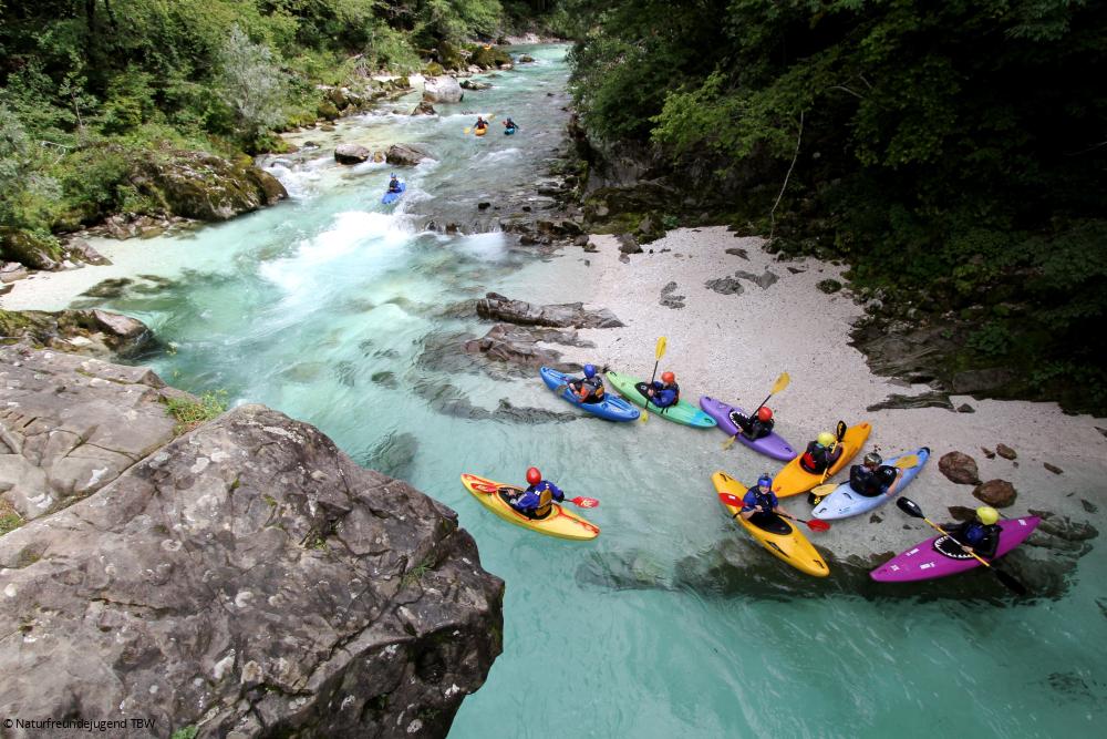 Zum Beispiel im August das Aktivcamp in Slowenien für 14- bis 17-Jährige. Das slowenischen Socatal in den Julischen Alpen ist ein absoluter Sehnsuchtsort für Paddler. Das Wasser dort ist so klar, dass man das Gefühl hat zu schweben. Und die umliegenden Berge erlauben die tollsten Bergsportaktivitäten. Vorkenntnisse in den Sportarten sind nicht erforderlich, die Anreise erfolgt gemeinsam ab Bielefeld, vor Ort wird gezeltet und der Mitgliederpreis liegt bei 450 Euro für zwei Wochen. Hammer!